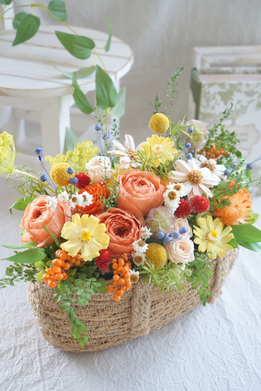 写真1枚目からアレンジ右側、左側、後ろ側、花器です。