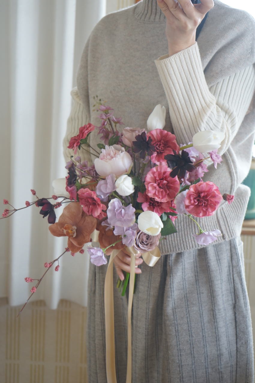 ニュアンスカラーのお花たちを束ねたブーケです!