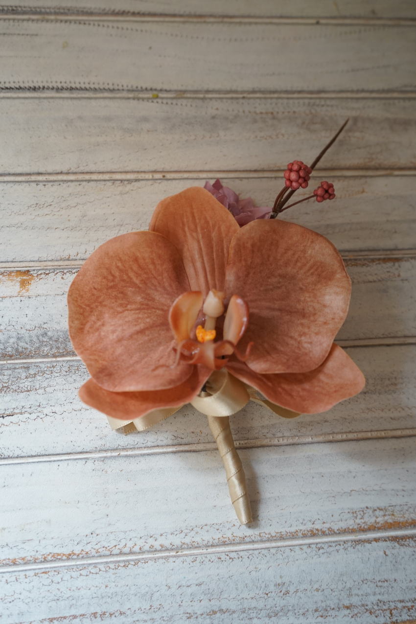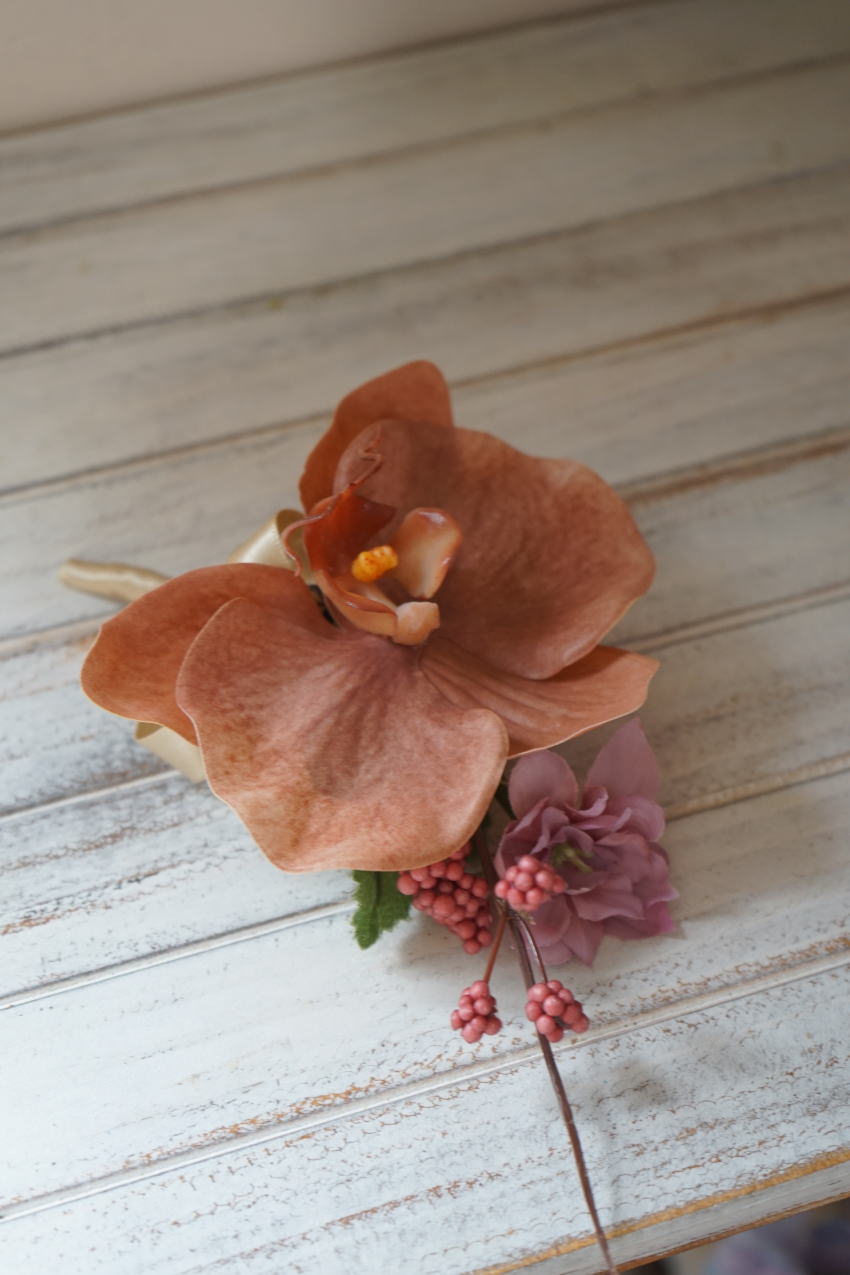 テラコッタ色の胡蝶蘭やレンガ色(赤茶)のローズ