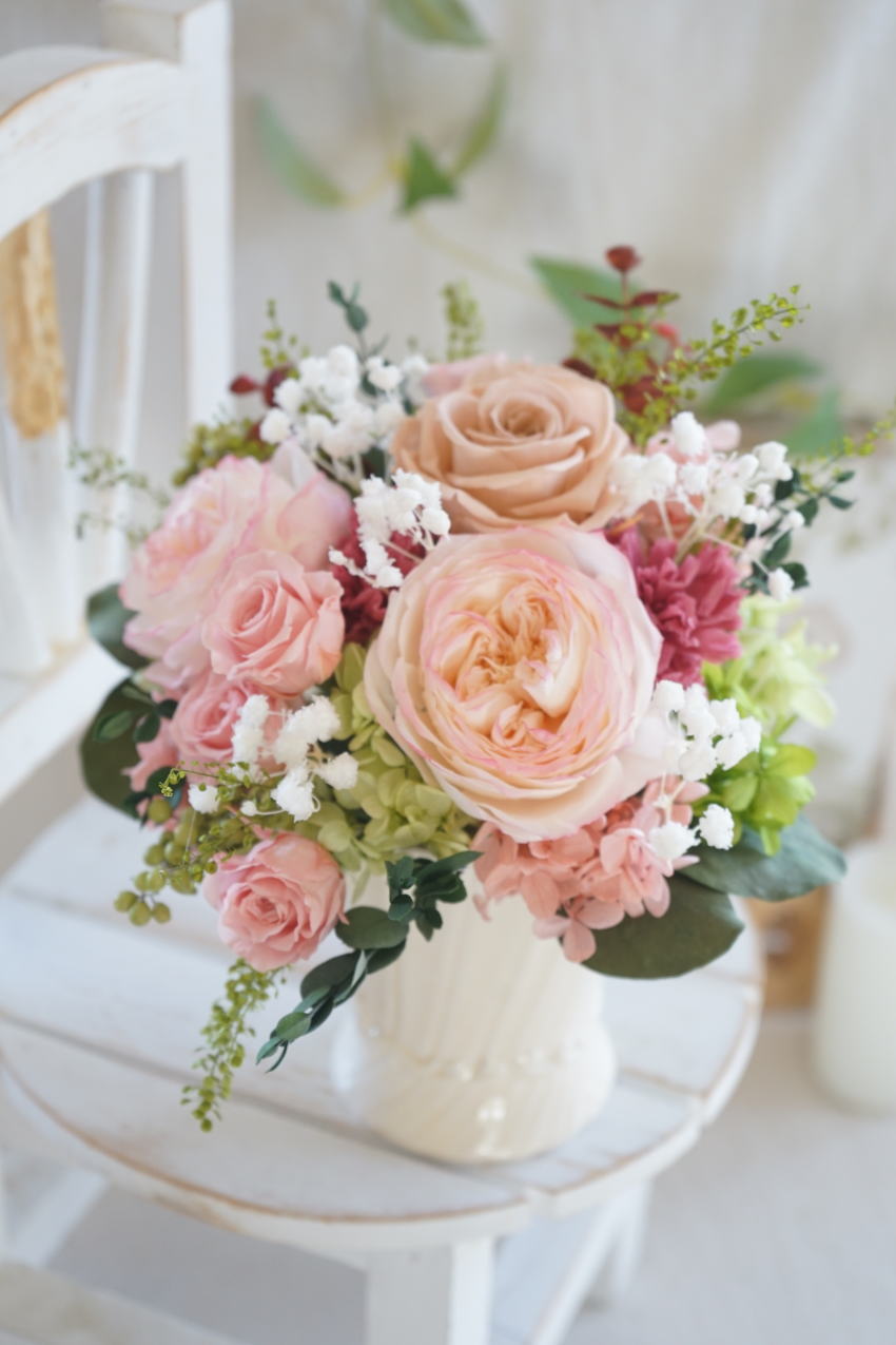 アンティークなホワイトの陶器に、優しいピンク色のバラ3種類をあつめてナチュラルにアレンジしています。